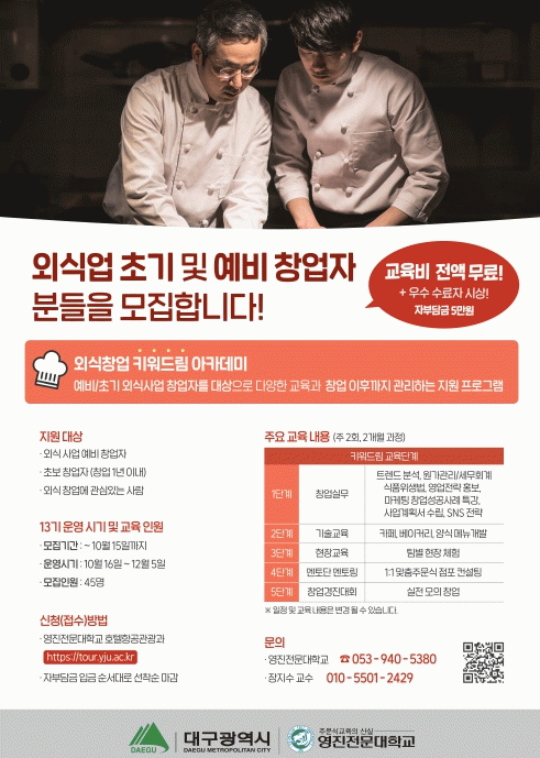 [´º½ºÅë ¾È»óµ· ±âÀÚ]´ë±¸±¤¿ª½Ã´Â ¿Ü½Ä¾÷ ¿¹ºñâ¾÷ÀÚ¿Í Ãʱâ â¾÷ÀÚÀÇ ¾ÈÁ¤Àû Á¤ÂøÀ» Áö¿øÇϱâ À§ÇØ ¿Ü½Äâ¾÷ ¡®Å°¿öµå¸²¡¯ ¾ÆÄ«µ¥¹Ì 13±â Âü°¡ÀÚ¸¦ 10¿ù 15ÀϱîÁö ¸ðÁýÇÑ´Ù.