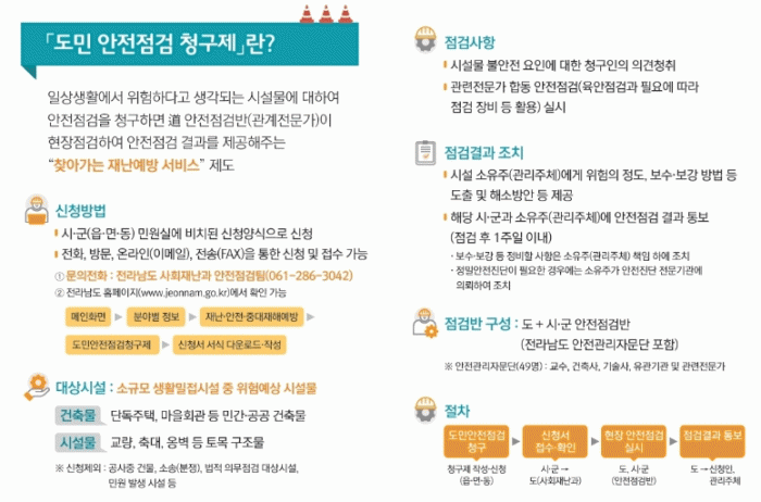 [´º½ºÅë ±è±¤¿ ±âÀÚ]Àü¶ó³²µµ´Â °¢Á¾ Àç³À¸·ÎºÎÅÍ µµ¹ÎÀÇ »ý¸í°ú Àç»êÀ» º¸È£Çϰí ÀÏ»ó »ýȰÁÖº¯¿¡ ºÒ¾ÈÀüÇÑ À§Çè¿ä¼Ò¸¦ ã¾Æ ¹«·á·Î ¾ÈÀüÁ¡°ËÇÏ´Â ¡®µµ¹Î ¾ÈÀüÁ¡°Ë û±¸Á¦¡¯¸¦ ¿î¿µÇϰí ÀÖ´Ù°í ¹àÇû´Ù.