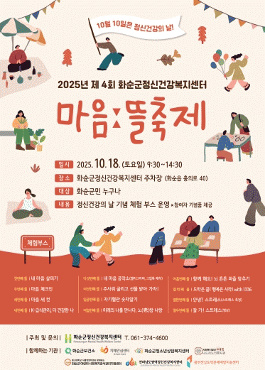 À̹ø ÃàÁ¦´Â ȼø±ºÁ¤½Å°Ç°º¹Áö¼¾ÅÍ¿¡¼ 10¿ù 18ÀÏ ¿ÀÀü 9½Ã 30ºÐºÎÅÍ ¿ÀÈÄ 2½Ã 30ºÐ±îÁö ¿¸®¸ç, Áö¿ª ÁֹΠ´©±¸³ª ¹«·á·Î Âü¿©ÇÒ ¼ö ÀÖ´Ù.