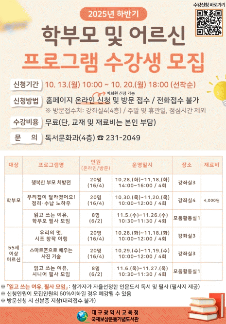 ¾î¸£½Å ´ë»óÀ¸·Î´Â ¡ã½ÃÁ¶¸¦ ÀÌÇØÇϰí âÀÛÇØ º¸´Â ¡®¿ì¸®ÀÇ ¸Ú, ½ÃÁ¶ âÀÛ ¿©Çà, ½º¸¶Æ®Æù Ä«¸Þ¶ó Ȱ¿ë¹ý¡¯, ¡ã»çÁø ÆíÁý ¹æ¹ýÀ» ÀÍÈú ¼ö ÀÖ´Â ¡®½º¸¶Æ®ÆùÀ¸·Î ¹è¿ì´Â »çÁø ±â¼ú¡¯ ÇÁ·Î±×·¥À» ¿î¿µÇÑ´Ù. ¶ÇÇÑ, ¡ãÇкθð ¹× ¾î¸£½Å ´ë»ó ÀÚÀ² ¼±Á¤ÇÑ Àι®µµ¼¸¦ ÇÊ»çÇÏ´Â ¡®ÀÐ°í ¾²´Â ¿©À¯, ÇÊ»ç ¸ðÀÓ¡¯À» ÁøÇàÇÑ´Ù.
