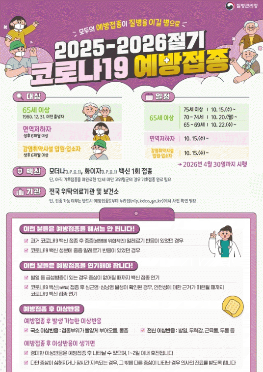 À̹ø Á¢Á¾Àº 65¼¼ ÀÌ»ó ¾î¸£½Å, »ýÈÄ 6°³¿ù ÀÌ»ó ¸é¿ªÀúÇÏÀÚ¿Í °¨¿°Ãë¾à½Ã¼³ ÀÔ¿ø¡¤ÀÔ¼ÒÀÚ¸¦ ´ë»óÀ¸·Î ½Ç½ÃµÈ´Ù.