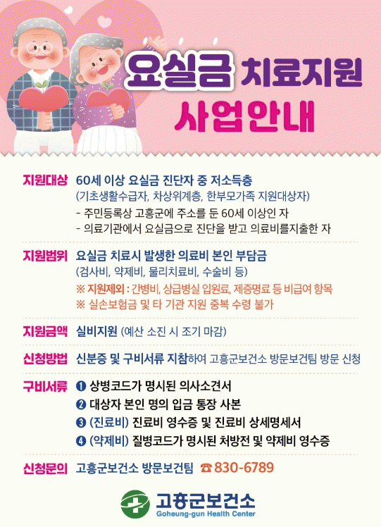 [´º½ºÅë ±è±¤¿ ±âÀÚ]°íÈﱺÀº °ü³» 60¼¼ ÀÌ»ó Àú¼ÒµæÃþ ¾î¸£½ÅÀ» ´ë»óÀ¸·Î ¡®¿ä½Ç±Ý Ä¡·á Áö¿ø»ç¾÷¡¯À» ½ÃÇàÇÑ´Ù°í ¹àÇû´Ù.