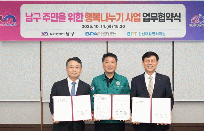 [´º½ºÅë °û¸íÈÆ ±âÀÚ]ºÎ»ê ³²±¸Ã»Àº Áö³ 10¿ù 14ÀÏ, ºÎ»êÇ׸¸°ø»ç(BPA), ½Å¼±´ë°¨¸¸Å͹̳Î(BPT)°ú ³²±¸ Áö¿ª Ãë¾à°èÃþÀ» Áö¿øÇÏ´Â '2025³â Çູ³ª´©±â »ç¾÷' ¾÷¹«Çù¾àÀ» ü°áÇß´Ù°í ¹àÇû´Ù.