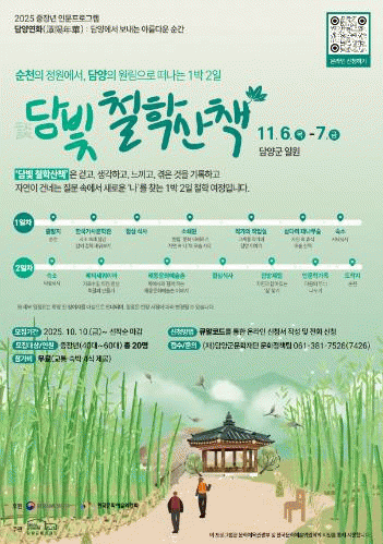 [´º½ºÅë ÃÖ¿ë¼ö ±âÀÚ]´ã¾ç±º¹®ÈÀç´ÜÀº ¹®ÈüÀ°°ü±¤ºÎ¿Í Çѱ¹¹®È¿¹¼úÀ§¿øÈ¸¿¡¼ ÈÄ¿øÇÏ´Â 2025 ÁßÀå³â Àι® ÇÁ·Î±×·¥ÀÇ ÀÏȯÀ¸·Î, ÀÚ¿¬ÀÌ °Ç³×´Â Áú¹® ¼Ó¿¡¼ »õ·Î¿î ¡®³ª¡¯¸¦ ã´Â 1¹Ú 2ÀÏ Ã¶ÇÐ ¿©Á¤ '´ãºû öÇлêÃ¥-´ã¾çÆí' Âü°¡ÀÚ¸¦ ¸ðÁýÇÑ´Ù°í ¹àÇû´Ù.