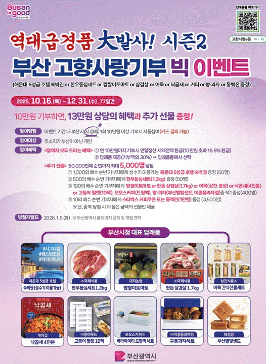 [´º½ºÅë °û¸íÈÆ ±âÀÚ]ºÎ»ê½Ã´Â ¿À´Ã(16ÀÏ)ºÎÅÍ 12¿ù 31ÀϱîÁö 77Àϰ£, °íÇâ»ç¶û±âºÎÁ¦ Âü¿© È®»êÀ» À§ÇØ '¿ª´ë±Þ °æÇ° ´ë¹ß»ç ½ÃÁð2! ºÎ»ê °íÇâ»ç¶û±âºÎÁ¦ ¿¬¸» ºò À̺¥Æ®'¸¦ °³ÃÖÇÑ´Ù°í ¹àÇû´Ù.
