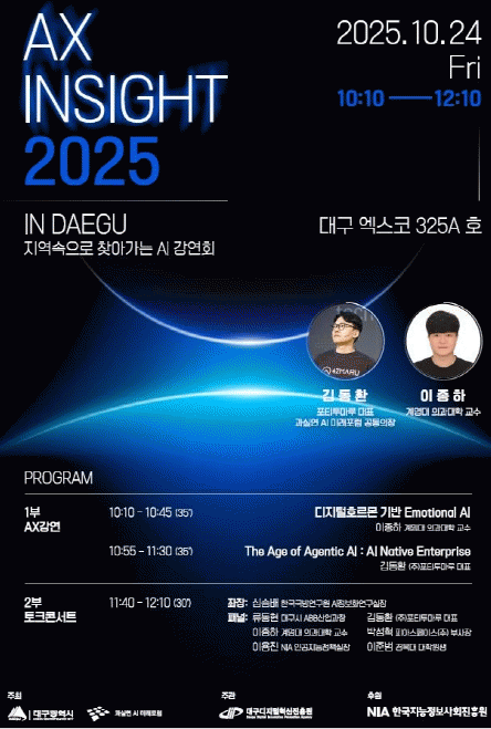 [´º½ºÅë ¾È»óµ· ±âÀÚ] ´ë±¸±¤¿ª½Ã´Â (»ç)°ú½Ç¿¬ AI¹Ì·¡Æ÷·³°ú ÇÔ²² 10¿ù 24ÀÏ(±Ý) ´ë±¸ ¿¢½ºÄÚ¿¡¼ ¡®AX¡¤Security Insight 2025 In Daegu¡¯¸¦ °³ÃÖÇÑ´Ù.