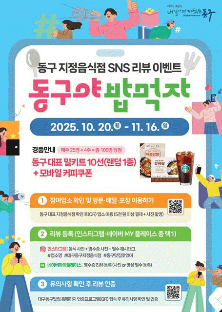 [´º½ºÅë ¾È»óµ· ±âÀÚ]´ë±¸ µ¿±¸Ã»Àº ÁöÁ¤À½½ÄÁ¡ È«º¸¿Í ¿Ü½Ä»ê¾÷ Ȱ¼ºÈ¸¦ À§ÇØ 20ÀϺÎÅÍ 11¿ù 16ÀϱîÁö 4ÁÖ°£ ¡®µ¿±¸ ÁöÁ¤À½½ÄÁ¡ È«º¸ SNS ÀÎÁõ¼¦ & ¸®ºä À̺¥Æ®¡¯¸¦ ½Ç½ÃÇÑ´Ù.