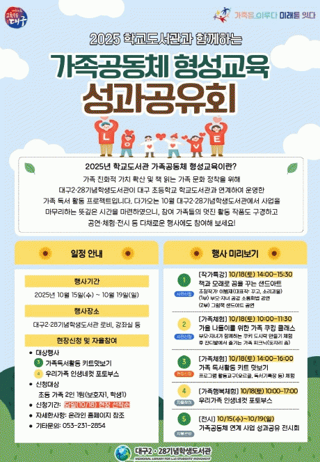 [´º½ºÅë ¾È»óµ· ±âÀÚ] ´ë±¸2¡¤28±â³äÇлýµµ¼°üÀº 10¿ù 15ÀϺÎÅÍ 19ÀϱîÁö Çлý, Çкθð, ½Ã¹Î µîÀ» ´ë»óÀ¸·Î¡®Çб³µµ¼°ü°ú ÇÔ²²ÇÏ´Â °¡Á·°øµ¿Ã¼ Çü¼º±³À° ¼º°ú°øÀ¯È¸¡¯¸¦ °³ÃÖÇÑ´Ù.