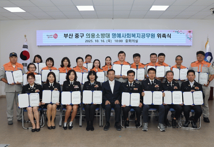 [´º½ºÅë °û¸íÈÆ ±âÀÚ] ºÎ»ê Áß±¸´Â Áö³ 16ÀÏ ÁßºÎ¼Ò¹æ¼ ÀÇ¿ë¼Ò¹æ´ë¿ø 54¸íÀ» Áß±¸ ¸í¿¹»çȸº¹Áö°ø¹«¿øÀ¸·Î À§ÃËÇÏ´Â Çà»ç¸¦ °³ÃÖÇß°í, ÁßºÎ¼Ò¹æ¼ ÀÇ¿ë¼Ò¹æ´ë º»´ë À̺À¼® ³²¼º´ëÀå, ½É°æ¶õ ¿©¼º´ëÀåµîÀÌ Âü¼®Çß´Ù.