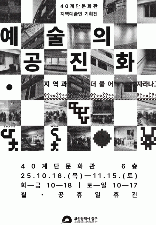 [´º½ºÅë °û¸íÈÆ ±âÀÚ] ºÎ»ê±¤¿ª½Ã Áß±¸´Â 10¿ù 16ÀϺÎÅÍ 11¿ù 15ÀϱîÁö 40°è´Ü¹®È°ü 6Ãþ Àü½Ã½Ç¿¡¼ Áö¿ª¿¹¼úÀÎ ±âȹÀü'¿¹¼úÀÇ °øÁøÈ, Áö¿ª°ú ´õºÒ¾î Àڶ󳪰í'¸¦ °³ÃÖÇÑ´Ù.