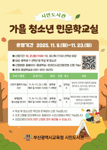 [´º½ºÅë °û¸íÈÆ ±âÀÚ]ºÎ»ê±¤¿ª½Ã¸³½Ã¹Îµµ¼°üÀº ¿À´Â 11¿ù 9ÀϺÎÅÍ 23ÀϱîÁö ½Ã¹Îµµ¼°ü¿¡¼ ºÎ»ê Áö¿ª ÁßÇлý°ú Çб³ ¹Û û¼Ò³â 30¸íÀ» ´ë»óÀ¸·Î ¡®°¡À» û¼Ò³â Àι®ÇÐ ±³½Ç¡¯À» ¿î¿µÇÑ´Ù.