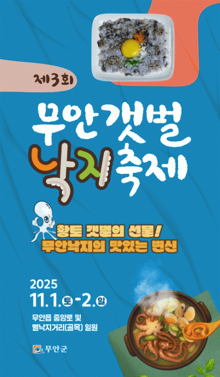 [´º½ºÅë ÃÖ¿ë¼ö ±âÀÚ]Àü³² ¹«¾È±ºÀº 11¿ù 1, 2ÀÏ ÀÌÆ²°£ 'ȲÅä°¹¹úÀÇ ¼±¹°! ¹«¾È³«ÁöÀÇ ¸ÀÀÖ´Â º¯½Å' À̶ó´Â ÁÖÁ¦·Î ¹«¾ÈÀ¾ »¹³«Áö °Å¸® ¹× Áß¾Ó·Î ÀÏ¿ø¿¡¼ Á¦3ȸ ¹«¾È°¹¹ú³«ÁöÃàÁ¦¸¦ °³ÃÖÇÑ´Ù.