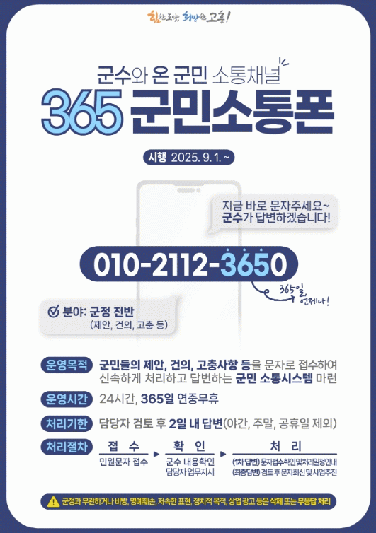[´º½ºÅë ±è±¤¿ ±âÀÚ]°íÈﱺÀº ±º¹Î°úÀÇ ¼ÒÅëÀ» °ÈÇϰí ÇöÀåÀÇ ¸ñ¼Ò¸®¸¦ ½Å¼ÓÇÏ°Ô ¼ö·ÅÇϱâ À§ÇØ ¿î¿µ ÁßÀÎ ±º¼ö¿Í ¿Â ±º¹Î ¼ÒÅëä³Î '365 ±º¹Î¼ÒÅëÆù'ÀÌ ½ÃÇà ÇÑ ´Þ¿© ¸¸¿¡ ÃÑ 203°ÇÀÇ ¹Î¿ø Á¢¼ö¿Í 94%ÀÇ Ã³¸®À²À» ±â·ÏÇÏ¸ç °¡½ÃÀûÀÎ ¼º°ú¸¦ °ÅµÎ°í ÀÖ´Ù°í ¹àÇû´Ù.