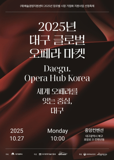 [´º½ºÅë ¾È»óµ· ±âÀÚ](Àç)´ë±¸¹®È¿¹¼úÁøÈï¿ø ´ë±¸¿ÀÆä¶óÇϿ콺´Â ¹®ÈüÀ°°ü±¤ºÎ¿Í ¿¹¼ú°æ¿µÁö¿ø¼¾ÅͰ¡ ÃßÁøÇϴ¡®2025 À帣º° ½ÃÀå °ÅÁ¡È Áö¿ø»ç¾÷¡¯¿¡ ¼±Á¤µÅ, ¿À´Â 10¿ù 27ÀÏ Áß¾ÓÄÁº¥¼ÇȦ(´ë±¸ ºÏ±¸ È£¾Ï·Î 51)¿¡¼ ¡®2025 ´ë±¸ ±Û·Î¹ú ¿ÀÆä¶ó ¸¶ÄÏ¡¯À» °³ÃÖÇÑ´Ù.