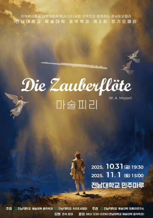 Àü³²´ë ¿¹¼ú´ëÇÐ À½¾ÇÇаú´Â ¿À´Â 10¿ù 31ÀÏ ¿ÀÈÄ 7½Ã 30ºÐ°ú 11¿ù 1ÀÏ ¿ÀÈÄ 3½Ã, Àü³²´ëÇб³ ¹ÎÁÖ¸¶·ç¿¡¼ Á¦5ȸ Á¤±â¿ÀÆä¶ó ¡®¸¶¼úÇǸ®¡¯(Die Zauberflote)¸¦ ¹«´ë¿¡ ¿Ã¸°´Ù.