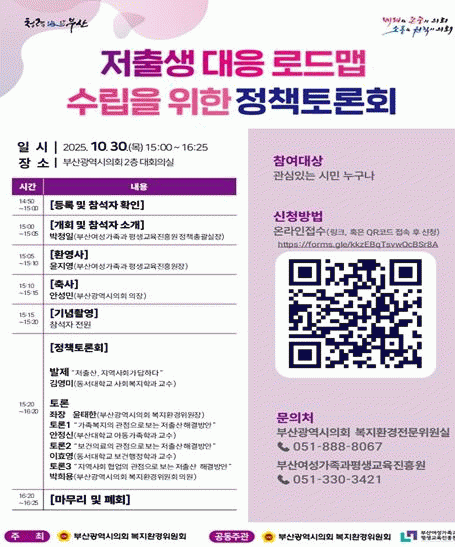 [´º½ºÅë °û¸íÈÆ ±âÀÚ]ºÎ»ê±¤¿ª½ÃÀÇȸ º¹Áöȯ°æÀ§¿øÈ¸ À±ÅÂÇÑ À§¿øÀå(»ç»ó±¸1, ±¹¹ÎÀÇÈû)Àº 2025³â 10¿ù 30ÀÏ 15½Ã ºÎ»ê±¤¿ª½ÃÀÇȸ 2Ãþ, ´ëȸÀǽǿ¡¼ ?ÀúÃâ»ý ´ëÀÀ ·Îµå¸Ê ¼ö¸³À» À§ÇÑ Á¤Ã¥Åä·Ðȸ?¸¦ °³ÃÖÇÑ´Ù°í ÀüÇß´Ù.