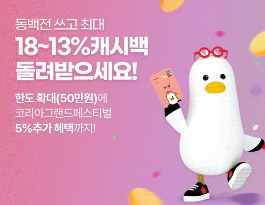 ¶ÇÇÑ, ½Ã´Â 10¿ù 29ÀϺÎÅÍ 11¿ù 9ÀϱîÁö ÁøÇàµÇ´Â Àü±¹ ´ÜÀ§ ´ë±Ô¸ð ÇÒÀÎ Çà»çÀÎ 'ÄÚ¸®¾Æ ±×·£µå Æä½ºÆ¼¹ú' ±â°£¿¡´Â ij½Ã¹é ¿äÀ²À» ÇѽÃÀûÀ¸·Î ÃÖ´ë 18ÆÛ¼¾Æ®(%)±îÁö ÀλóÇϰí, 50¸¸ ¿øÀÇ º°µµ Çѵµ¸¦ Ãß°¡ Àû¿ëÇÏ¿© ¿î¿µÇÑ´Ù.