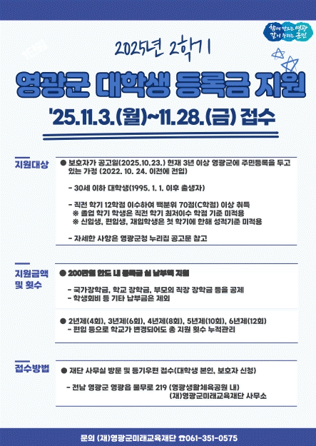 [´º½ºÅë ±è±¤¿ ±âÀÚ](Àç)¿µ±¤±º¹Ì·¡±³À°Àç´Ü(ÀÌ»çÀå Àå¼¼ÀÏ)ÀÌ ±º¹ÎÀÇ ±³À°ºñ ºÎ´ãÀ» ÁÙÀ̰í Áö¿ªÀÇ ¹Ì·¡ ÀÎÀ縦 À°¼ºÇϱâ À§ÇÑ 2025³â 2Çб⠴ëÇлý µî·Ï±Ý Áö¿ø»ç¾÷À» ½ÃÇàÇÑ´Ù.