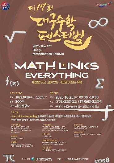[´º½ºÅë ¾È»óµ· ±âÀÚ] ´ë±¸½Ã±³À°Ã»ÀÌ ÁÖÃÖÇÏ°í ´ë±¸Áßµî¼öÇб³À°¿¬±¸È¸°¡ ¿î¿µÇÏ´Â ¡®Á¦17ȸ ´ë±¸¼öÇÐÆä½ºÆ¼¹ú¡¯ÀÌ 10¿ù 25ÀÏ 9½Ã 30ºÐºÎÅÍ ´ë±¸°úÇÐ°í ¹× ´ë±¸Ã¢ÀÇÀ¶ÇÕ±³À°¿ø¿¡¼ 'Math Links Everything(¼öÇÐÀº ¸ðµç °ÍÀ» ¿¬°áÇÑ´Ù)'À̶ó´Â ÁÖÁ¦·Î °³ÃֵȴÙ.