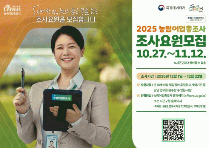 [´º½ºÅë ÃÖ¿ë¼ö ±âÀÚ]¼øÃµ½Ã´Â ¿À´Â 11¿ù ¸»ºÎÅÍ ½Ç½ÃµÇ´Â 2025 ³ó¸²¾î¾÷ÃÑÁ¶»ç ¾÷¹«¸¦ ¼öÇàÇÒ Á¶»ç¿ä¿øÀ» ¸ðÁýÇÑ´Ù°í ¹àÇû´Ù.