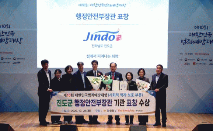 [´º½ºÅë ÃÖ¿ë¼ö ±âÀÚ]Áøµµ±ºÀº 10¿ù 28ÀÏ¿¡ °æÂûû°ú Áß¾ÓÀϺ¸, Á¦ÀÌÆ¼ºñ¾¾(JTBC)°¡ ÁÖ°üÇÑ ¡®Á¦10ȸ ´ëÇѹα¹ ¹üÁË¿¹¹æ´ë»ó¡¯ ½Ã»ó½Ä¿¡¼ »çȸÀû ¾àÀÚ º¸È£ ºÎ¹® ¡®ÇàÁ¤¾ÈÀüºÎ Àå°ü»ó¡¯À» ¼ö»óÇß´Ù°í ¹àÇû´Ù.
