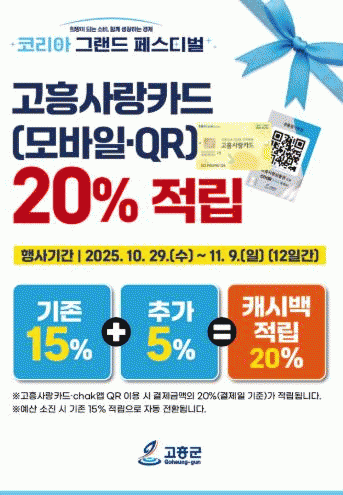 [´º½ºÅë ±è±¤¿ ±âÀÚ]°íÈﱺÀº Àü±¹ ´ë±Ô¸ð ÇÒÀÎ ÃàÁ¦ÀÎ ¡®ÄÚ¸®¾Æ ±×·£µå Æä½ºÆ¼¹ú¡¯À» ±â³äÇØ 10¿ù 29ÀϺÎÅÍ 11¿ù 9ÀϱîÁö 12Àϰ£ ¸ð¹ÙÀÏ °íÈï»ç¶û»óǰ±Ç 20% Àû¸³ À̺¥Æ®¸¦ ÁøÇàÇÑ´Ù°í ¹àÇû´Ù.