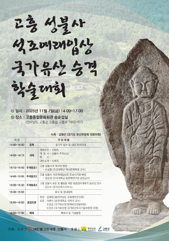 À̹ø Çмú´ëȸ´Â Àü¶ó³²µµ¿Í °íÈﱺÀÌ ÁÖÃÖÇϰí, ´ëÇѺұ³Á¶°èÁ¾ ¼ººÒ»ç¿Í û¶÷¹®ÈÀ¯»ê¿¬±¸¿øÀÌ ÁÖ°üÇØ ÁøÇàÇÒ ¿¹Á¤ÀÌ´Ù. Àü¶ó³²µµ À¯Çü¹®ÈÀ¯»ê Á¦250È£ÀÎ ¡®°íÈï ¼ººÒ»ç ¼®Á¶¿©·¡ÀÔ»ó¡¯ÀÇ ±¹°¡À¯»êÀû °¡Ä¡¸¦ ÀçÆò°¡Çϰí, ¼ººÒ»ç(ÁÖÁö Áö¾Ï½º´Ô)¸¦ ºñ·ÔÇÑ °íÈï Áö¿ª ºÒ±³¹®ÈÀ¯»êÀÇ ¿ª»çÀû Àǹ̸¦ ÀçÁ¶¸íÇϱâ À§ÇØ ¸¶·ÃµÆ´Ù.