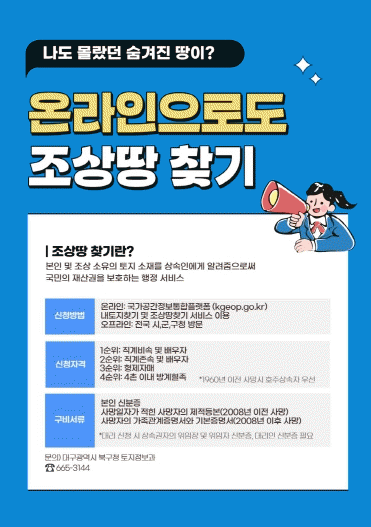 [´º½ºÅë ¾È»óµ· ±âÀÚ]´ë±¸ ºÏ±¸Ã»Àº ½Ã¹ÎµéÀÇ Àç»ê±Ç º¸È£¿Í ÅäÁö Àç»ê °ü¸® ÆíÀÇ Á¦°øÀ» À§ÇØ ¡®Á¶»ó¶¥ ã±â¡¯¼ºñ½º¸¦ »ó½Ã ¿î¿µ ÁßÀ̶ó°í ¹àÇû´Ù.