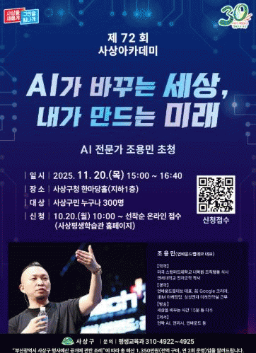 [´º½ºÅë °û¸íÈÆ ±âÀÚ]ºÎ»ê »ç»ó±¸´Â ¿À´Â 11¿ù 20ÀÏ ¿ÀÈÄ 3½Ã, »ç»ó±¸Ã» ÇѸ¶´çȦ¿¡¼ ¡®AI°¡ ¹Ù²Ù´Â ¼¼»ó, ³»°¡ ¸¸µå´Â ¹Ì·¡¡¯¸¦ ÁÖÁ¦·Î Á¦72ȸ »ç»ó¾ÆÄ«µ¥¹Ì¸¦ °³ÃÖÇÑ´Ù.