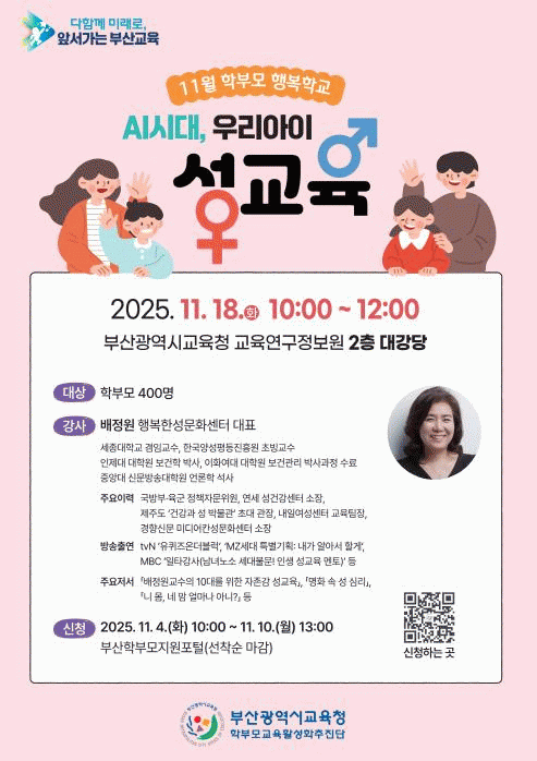 11¿ù Çкθð ÇູÇб³´Â ¡®AI ½Ã´ë, ¿ì¸®¾ÆÀÌ ¼º±³À°¡¯À̶ó´Â ÁÖÁ¦·Î, µðÁöÅРȯ°æ ¼Ó¿¡¼ Àڳడ Á¢ÇÏ°Ô µÇ´Â ¼º °ü·Ã Á¤º¸ÀÇ À§Ç輺°ú À¯ÇØ ÄÜÅÙÃ÷ ³ëÃâ ¹®Á¦¸¦ ¿Ã¹Ù¸£°Ô ÀÌÇØÇϰí, °¡Á¤¿¡¼ ½ÇõÇÒ ¼ö ÀÖ´Â ¼º±³À° ´ëȹý°ú Áöµµ ¹æÇâÀ» ÇÔ²² ´Ù·ç´Â ³»¿ëÀ¸·Î ±¸¼ºµÈ´Ù.