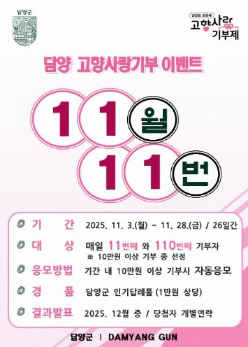[´º½ºÅë ÃÖ¿ë¼ö ±âÀÚ] ´ã¾ç±ºÀÌ 11¿ùÀ» ¸ÂÀÌÇØ 3ÀϺÎÅÍ 28ÀϱîÁö ¸ÅÀÏ 11¹øÂ°, 110¹øÂ° °íÇâ»ç¶û ±âºÎÀÚ¿¡°Ô Àα⠴ä·ÊǰÀ» ÁõÁ¤ÇÏ´Â À̺¥Æ®¸¦ ÁøÇàÇÑ´Ù.