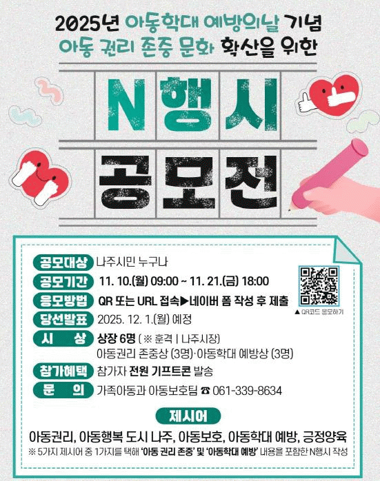 °ø¸ðÀüÀº ³ªÁÖ ½Ã¹Î ´©±¸³ª Âü¿©ÇÒ ¼ö ÀÖÀ¸¸ç Á¦½Ã¾î(¾Æµ¿ ±Ç¸®, ¾Æµ¿Çູ µµ½Ã ³ªÁÖ, ¾Æµ¿º¸È£, ¾Æµ¿ÇÐ´ë ¿¹¹æ, ±àÁ¤ ¾çÀ°) Áß ÇÑ °¡Áö¸¦ ¼±ÅÃÇØ ¡®¾Æµ¿ ±Ç¸® Á¸Áß¡¯°ú ¡®¾Æµ¿ÇÐ´ë ¿¹¹æ¡¯ÀÇ Àǹ̸¦ ´ãÀº NÇà½Ã¸¦ ÀÛ¼ºÇÏ¸é µÈ´Ù.