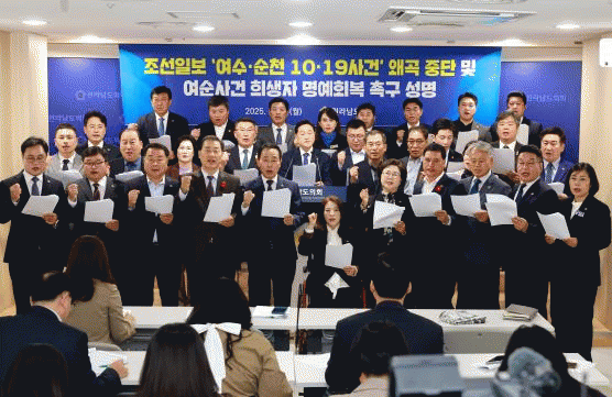 [´º½ºÅë ÃÖ¿ë¼ö ±âÀÚ]Àü¶ó³²µµÀÇȸ °¹®¼º ÀÇ¿ø(±âȹÇàÁ¤À§¿øÀå, ´õºÒ¾î¹ÎÁÖ´ç, ¿©¼ö3) µî Àü¶ó³²µµÀÇ¿øµéÀÌ 11¿ù 3ÀÏ Á¶¼±ÀϺ¸ÀÇ '¿©¼ö¡¤¼øÃµ 10¡¤19 »ç°Ç' ¿Ö°î º¸µµ¿¡ ´ëÇØ °ÇÑ À¯°¨À» Ç¥¸íÇϰí Èñ»ýÀÚ ¸í¿¹È¸º¹À» Ã˱¸ÇÏ´Â ¼º¸íÀ» ¹ßÇ¥Çß´Ù.