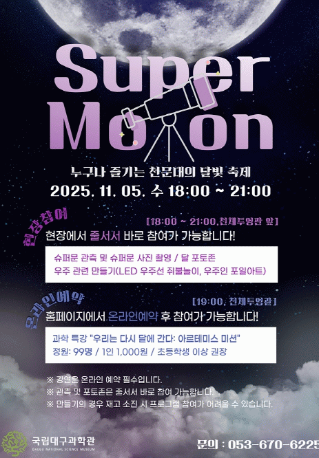 ¿ÃÇØÀÇ ½´ÆÛ¹®Àº 11¿ù 5ÀÏ¿¡ °üÃøÇÒ ¼ö ÀÖÀ¸¸ç, 2025³â °üÃøµÇ´Â ´ÞÀÇ Å©±â Áß¿¡ °¡Àå Å©°í ¹à°Ô º¸ÀÌ´Â ´ÞÀÌ´Ù. À̸¦ ±â³äÇÏ¿© ±¹¸³´ë±¸°úÇаü¿¡¼´Â 11¿ù 5ÀÏ ½´ÆÛ¹® °üÃøÇà»ç¸¦ °³ÃÖÇÑ´Ù.