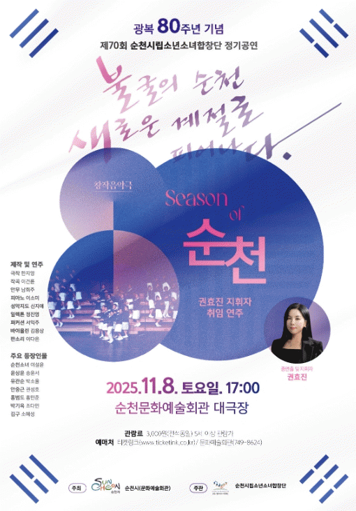 [´º½ºÅë ±è±¤¿ ±âÀÚ]¼øÃµ½Ã´Â ¿À´Â 8ÀÏ Åä¿äÀÏ ¿ÀÈÄ 5½Ã, ¼øÃµ¹®È¿¹¼úȸ°ü ´ë±ØÀå¿¡¼ ¼øÃµ½Ã¸³¼Ò³â¼Ò³àÇÕâ´Ü Á¦70ȸ Á¤±â¿¬ÁÖȸ âÀÛÇÕâÀ½¾Ç±Ø 'Season of ¼øÃµ'À» °³ÃÖÇÑ´Ù°í ¹àÇû´Ù.