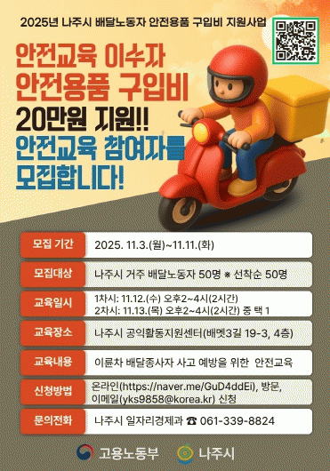 ¾ÈÀü±³À°Àº ¿À´Â 12ÀϺÎÅÍ 13ÀϱîÁö ÀÌÆ²°£ ºû°¡¶÷µ¿ ¼ÒÀç ³ªÁֽà °øÀÍȰµ¿Áö¿ø¼¾ÅÍ¿¡¼ ½Ç½ÃÇÏ¸ç ±³À° ½ÃÀÛ Àü ÀϱîÁö ¾ÈÀü±³À° QR(¾È³» Æ÷½ºÅÍ)¿¡ Á¢¼ÓÇÏ¿© ¿Â¶óÀÎÀ¸·Î ½Åû¼¸¦ ÀÛ¼ºÇϰųª ³ªÁÖ½Ãû ÀÏÀÚ¸®°æÁ¦°ú ¹æ¹® ¶Ç´Â À̸ÞÀÏ·Î ½ÅûÇÒ ¼ö ÀÖ´Ù.