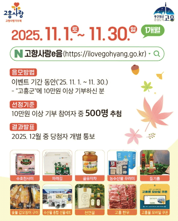 [´º½ºÅë ±è±¤¿ ±âÀÚ]°íÈﱺÀº À¯ÀÚÇâÀÌ °¡µæÇÑ 11¿ùÀ» ¸Â¾Æ °íÇâ»ç¶û±âºÎÁ¦ Âü¿©ÀÚ¿¡°Ô °¨»çÀÇ ¸¶À½À» ÀüÇϱâ À§ÇØ ¡®°íÈï¾Ö(äñ) ¿¬¸»Á¤»ê À̺¥Æ®¡¯¸¦ 11¿ù 30ÀϱîÁö ¿î¿µÇÑ´Ù°í ¹àÇû´Ù.