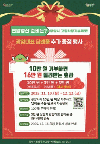 [´º½ºÅë ÃÖ¿ë¼ö ±âÀÚ]±¤¾ç½Ã°¡ ¿¬¸»Á¤»ê ½Ã±â¸¦ ¸Â¾Æ ¿À´Â 11¿ù 10ÀϺÎÅÍ 12¿ù 12ÀϱîÁö °íÇâ»ç¶û±âºÎÁ¦¿¡ Âü¿©ÇÑ ±âºÎÀÚ¸¦ ´ë»óÀ¸·Î ±¤¾ç ´ëÇ¥ ´ä·ÊǰÀ» Ãß°¡ ÁõÁ¤ÇÏ´Â Çà»ç¸¦ ÁøÇàÇÑ´Ù.