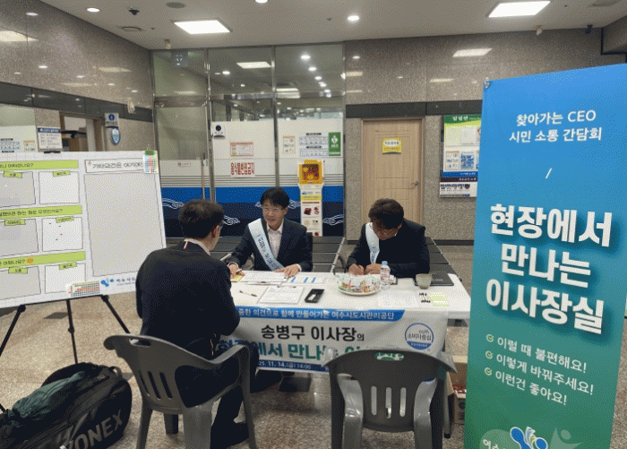 [´º½ºÅë ÃÖ¿ë¼ö ±âÀÚ]¿©¼ö½Ãµµ½Ã°ü¸®°ø´Ü(ÀÌ»çÀå ¼Ûº´±¸)Àº ½Ã¹Î°ú Á÷Á¢ ¼ÒÅëÇϱâ À§ÇÑ ÇöÀå ÇàÁ¤ÀÇ ¹®À» ¿¾ú´Ù°í ¹àÇû´Ù. Áö³ 11¿ù 13ÀÏ Áø³²¼ö¿µÀå°ú Àå¾ÖÀα¹¹ÎüÀ°¼¾ÅÍ, 14ÀÏ ¸Á¸¶±¹¹ÎüÀ°¼¾ÅÍ¿¡¼ ã¾Æ°¡´Â CEO ½Ã¹Î ¼ÒÅë °£´ãȸ ¡±ÇöÀå¿¡¼ ¸¸³ª´Â ÀÌ»çÀå½Ç¡°À» ¿î¿µÇÏ¸ç ½Ã¹Î°ú ¼ÒÅëÇÏ´Â ÀÚ¸®¸¦ °¡Á³´Ù.