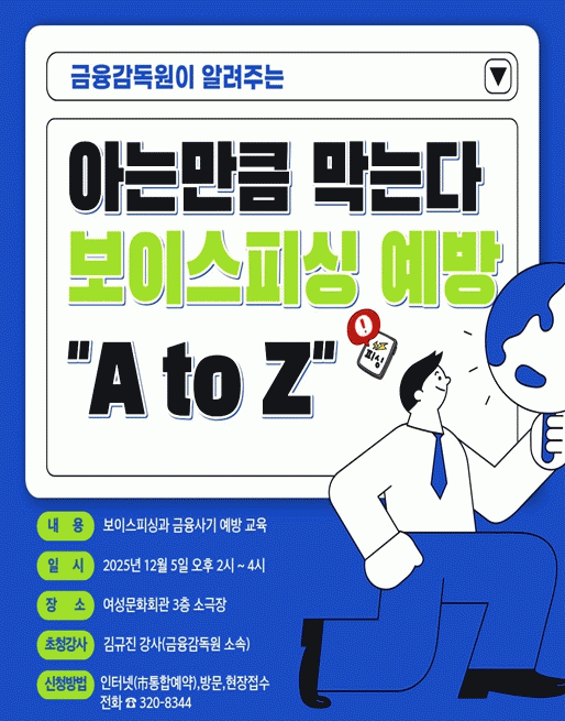 [´º½ºÅë °û¸íÈÆ ±âÀÚ]ºÎ»ê½Ã ¿©¼º¹®Èȸ°üÀº ¿À´Â 12¿ù 5ÀÏ ¿ÀÈÄ 2½ÃºÎÅÍ 4½Ã±îÁö ¿©¼º¹®Èȸ°ü¿¡¼ ±ÝÀ¶°¨µ¶¿ø°ú ¿¬°èÇÏ¿© '¾Æ´Â ¸¸Å ¸·´Â´Ù! º¸À̽ºÇÇ½Ì ¿¹¹æ '¿¡ÀÌ Åõ Á¦Æ®(A to Z)''¸¦ ÁÖÁ¦·Î '2025³â ÇϹݱ⠿©¼º ÀÇ½Ä ÇԾ米À°'À» ¿î¿µÇÑ´Ù°í ¹àÇû´Ù.
