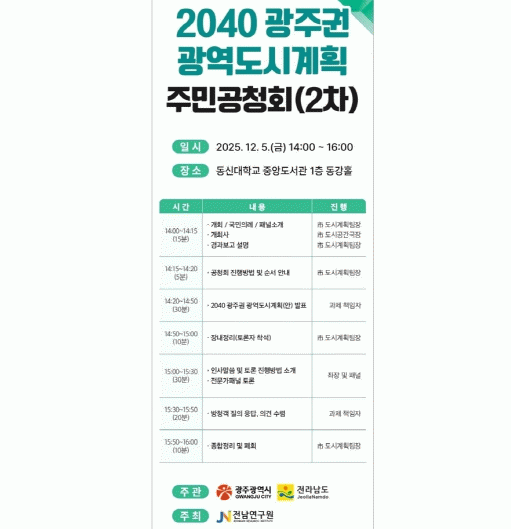 [´º½ºÅë ÃÖ¿ë¼ö ±âÀÚ]±¤ÁÖ±¤¿ª½Ã¿Í Àü¶ó³²µµ´Â 5ÀÏ Àü³² ³ªÁֽà µ¿½Å´ëÇб³ Áß¾Óµµ¼°ü µ¿°È¦¿¡¼ ¡®2040 ±¤ÁÖ±Ç ±¤¿ªµµ½Ã°èȹ(¾È) °øÃ»È¸¡¯¸¦ °³ÃÖÇÑ´Ù.