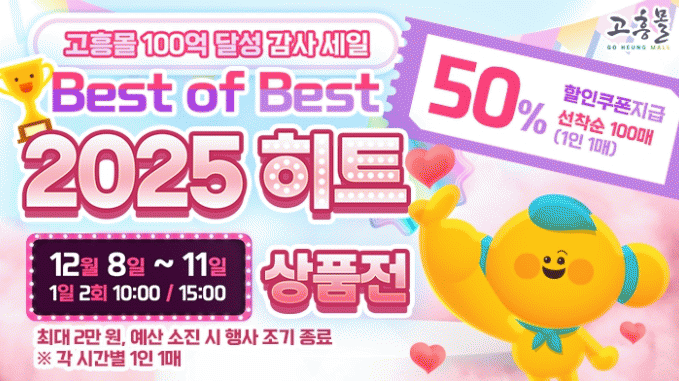 [´º½ºÅë ±è±¤¿ ±âÀÚ]°íÈﱺÀº Á÷¿µ ¿Â¶óÀÎ ³ó¼öÃàÆ¯»ê¹° ¼îÇθô ¡®°íÈï¸ô¡¯ÀÌ ´©Àû ¸ÅÃâ 100¾ï ¿ø µ¹ÆÄ¸¦ ±â³äÇØ ¿À´Â 1¿ù 8ÀϺÎÅÍ 11ÀϱîÁö ¡®100¾ï ´Þ¼º °¨»ç ¼¼ÀÏ-2025 Best of Best¡¯ ±âȹÀüÀ» ÁøÇàÇÑ´Ù°í ¹àÇû´Ù.