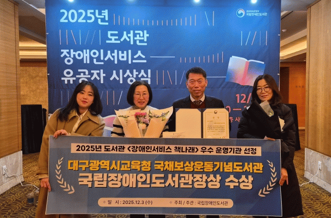 [´º½ºÅë ¾È»óµ· ±âÀÚ]´ë±¸±¹Ã¤º¸»ó¿îµ¿±â³äµµ¼°üÀÌ ¡®2025³â µµ¼°ü Àå¾ÖÀμºñ½º À¯°øÀÚ ½Ã»ó½Ä¡¯¿¡¼ '2025³â µµ¼°ü Àå¾ÖÀμºñ½º Ã¥³ª·¡ ¿ì¼ö ¿î¿µ±â°ü'¿¡ ¼±Á¤µÇ¾î ¡®±¹¸³Àå¾ÖÀεµ¼°üÀ塯À» ¼ö»óÇß´Ù.