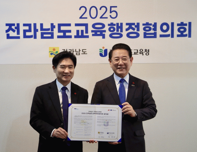 ±è´ëÁß Àü¶ó³²µµ±³À°°¨(¿ÞÂÊ)°ú ±è¿µ·Ï Àü³²µµÁö»ç°¡ 5ÀÏ ¡®2025 Àü¶ó³²µµ±³À°ÇàÁ¤ÇùÀÇȸ ÇÕÀǹ®¡¯À» µé°í ±â³ä»çÁø ÃÔ¿µÇϰí ÀÖ´Ù.
