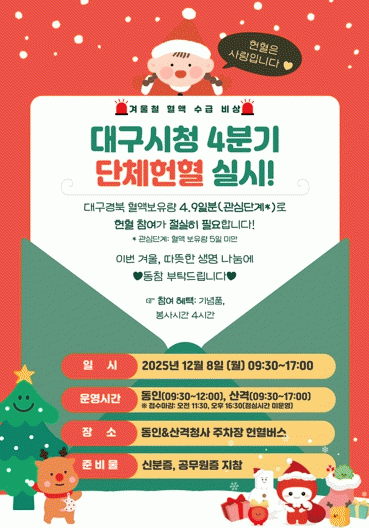 ¸Å³â °Ü¿ïö ÃßÀ§¿Í Áúº´, °Ü¿ï¹æÇÐ µî °èÀýÀû Ư¼ö¼º Å¿¿¡ Ç÷¾× ¼ö±ÞÀÇ ºÒ¾ÈÁ¤À» °Þ°í ÀÖÀ¸¸ç, ƯÈ÷ ¿¬¸» ¿¬ÈÞ¿¡´Â ÇåÇ÷ÀÚ ¼ö°¡ Å©°Ô ÁÙ¾îµç´Ù. ÀÌ¿¡ ´ë±¸½Ã´Â °ø°øºÎ¹®ÀÇ »ý¸í³ª´® ½ÇõÀ» Àû±Ø µ¶·ÁÇϰí ÀÖÀ¸¸ç, °Ü¿ïö Ç÷¾× ¼ö±Þ ¾ÈÁ¤À» À§ÇØ À̹ø ´ÜüÇåÇ÷ Çà»ç¸¦ °³ÃÖÇÏ´Â °ÍÀÌ´Ù.