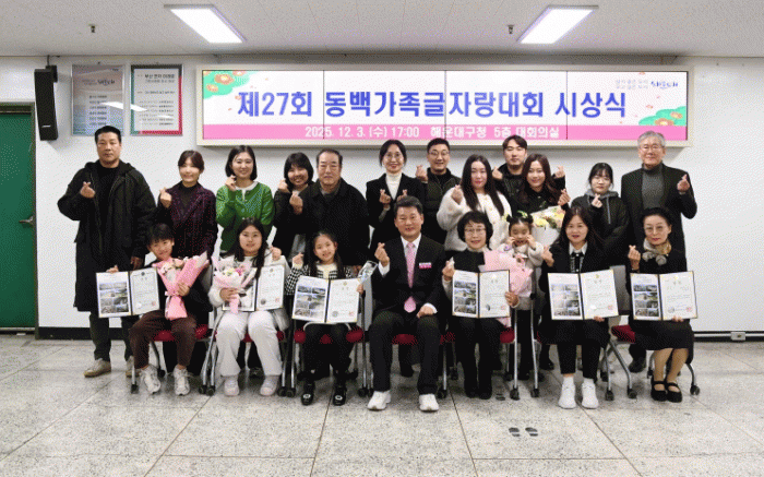 [´º½ºÅë °û¸íÈÆ ±âÀÚ]ÇØ¿î´ë±¸´Â 12¿ù 3ÀÏ, ¡®Á¦27ȸ µ¿¹é°¡Á·±ÛÀÚ¶û´ëȸ ½Ã»ó½Ä¡¯À» °³ÃÖÇß´Ù. µ¿¹é°¡Á·±ÛÀÚ¶û´ëȸ´Â °¡Á·ÀÇ ¼ÒÁßÇÑ À̾߱⸦ ±Û·Î ³ª´©¸ç ¼¼´ë °£ ¼ÒÅëÀ» À̾´Â ÇØ¿î´ë±¸ ´ëÇ¥ ±Û¾²±â ÃàÁ¦·Î ÀÚ¸®¸Å±èÇØ ¿Ô´Ù.