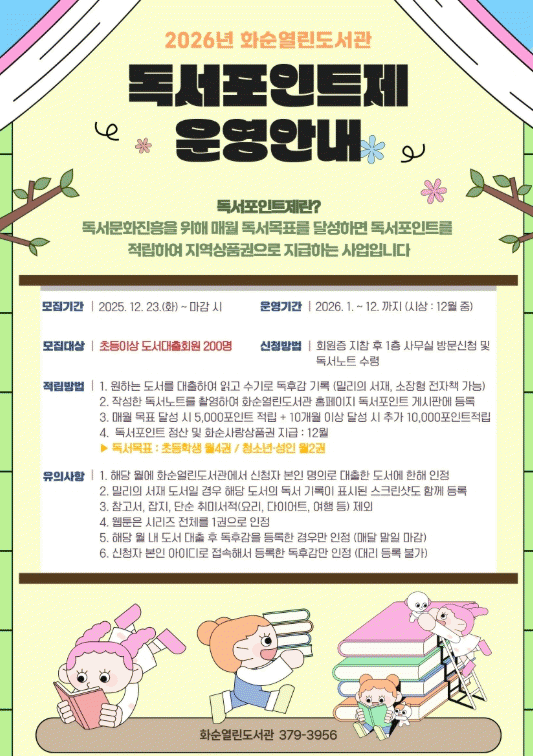 ÃʵîÇлýÀº ¸Å¿ù 5±Ç, ÁßÇлý ÀÌ»óÀº ¸Å¿ù 2±ÇÀÇ Ã¥À» Àаí, ȼø¿¸°µµ¼°ü ȨÆäÀÌÁö¿¡ µ¶¼ ³ëÆ®¸¦ µî·ÏÇϸé 5,000Æ÷ÀÎÆ®°¡ Àû¸³µÈ´Ù.
