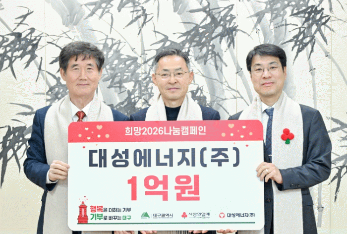 [´º½ºÅë ¾È»óµ· ±âÀÚ]´ë¼º¿¡³ÊÁö¢ß´Â 12¿ù 11ÀÏ ¿ÀÈÄ 2½Ã 30ºÐ, ´ë±¸±¤¿ª½Ãû »ê°Ýû»ç¿¡¼ ¡®Èñ¸Á2026 ³ª´® Ä·ÆäÀΡ¯ ¼º±Ý 1¾ï ¿øÀ» ´ë±¸»çȸº¹Áö°øµ¿¸ð±Ýȸ¿¡ Àü´ÞÇß´Ù.