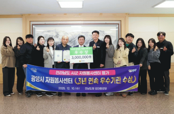 [´º½ºÅë ±è±¤¿ ±âÀÚ]±¤¾ç½Ã(±¤¾ç½ÃÀÚ¿øºÀ»ç¼¾ÅÍ)´Â Áö³ 10ÀÏ Àü³²µµÃ» ±è´ëÁß °´ç¿¡¼ ¿¸° ¡®2025 Àü¶ó³²µµ ÀÚ¿øºÀ»çÀÚ ´ëȸ¡¯¿¡¼ ½Ã±º ÀÚ¿øºÀ»ç¼¾ÅÍ Æò°¡ ¿ì¼ö»óÀ» ¼ö»óÇϸç 3³â ¿¬¼Ó ¿ì¼ö±â°üÀ¸·Î ¼±Á¤µÇ´Â Äè°Å¸¦ ÀÌ·ð´Ù°í ¹àÇû´Ù.