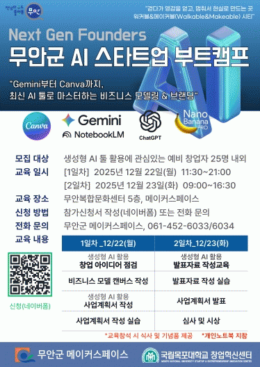 À̹ø ºÎƮķÇÁ´Â ¹«¾ÈÀ¾ ¸ÞÀÌÄ¿½ºÆäÀ̽º(ÀϹݷ¦)¿¡¼ ¿¹ºñ ¹× Ãʱâ â¾÷ÀÚ 25¸íÀ» ´ë»óÀ¸·Î ÁøÇàµÇ¸ç, ¡®GeminiºÎÅÍ Canva±îÁö, ÃֽŠAI Åø·Î ¸¶½ºÅÍÇÏ´Â ºñÁî´Ï½º ¸ðµ¨¸µ & ºê·£µù¡¯À» ÁÖÁ¦·Î â¾÷ ¾ÆÀ̵ð¾î ¹ß±¼ºÎÅÍ ÃÖÁ¾ »ç¾÷°èȹ¼ ÀÛ¼º, ¸ðÀÇ ¹ßÇ¥±îÁö ½Ç¹« Áß½ÉÀÇ ÁýÁß ±³À°ÀÌ ÀÌ·ïÁú ¿¹Á¤ÀÌ´Ù.